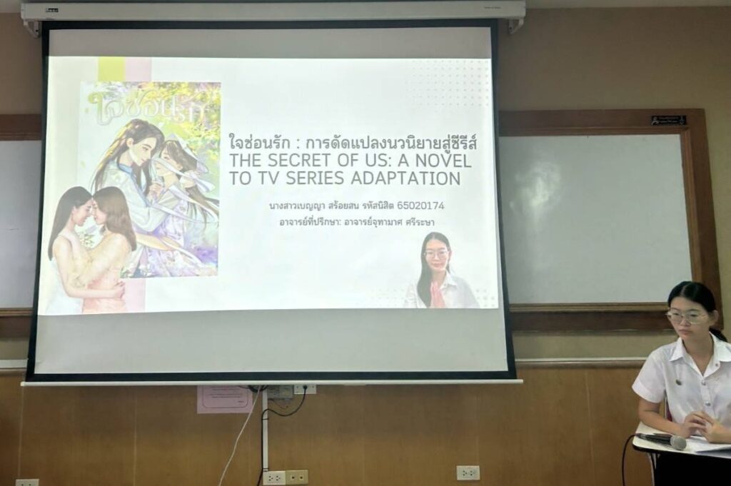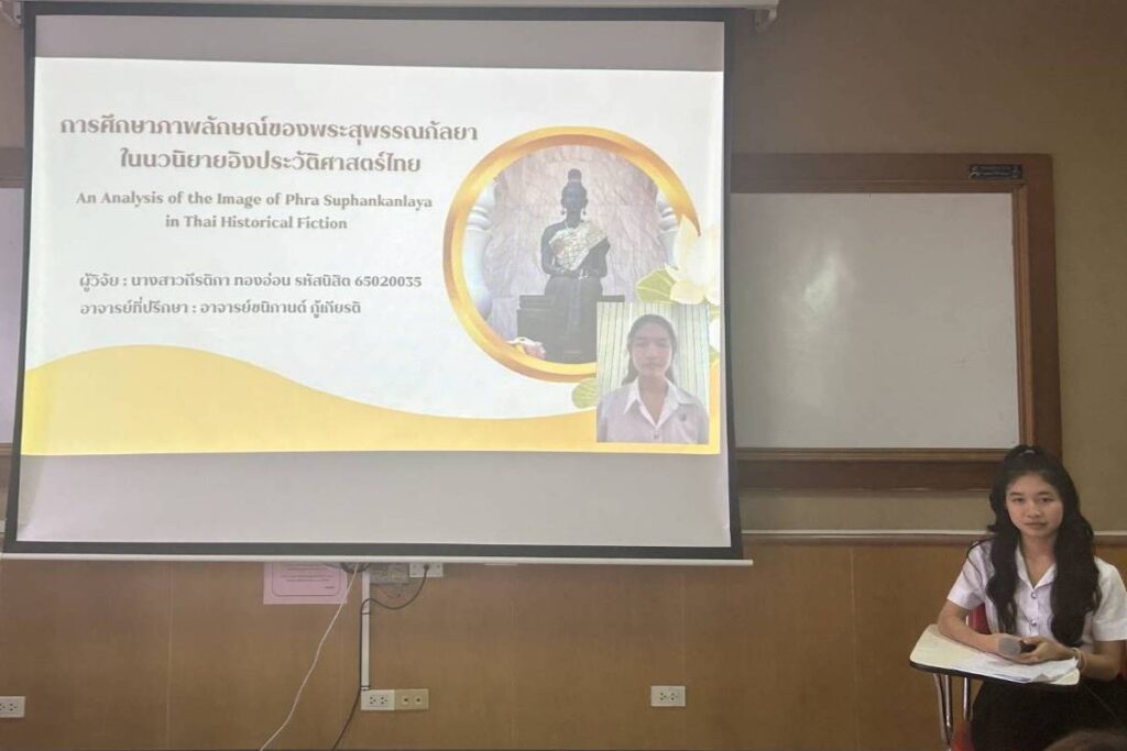 The curriculum also encourages students to engage with social equity issues, particularly gender equality, women’s roles, child development, and social gender diversity, directly reflecting SDG 5: Gender Equality under the commitment to achieve gender equality and empower all women and girls. Furthermore, the department aims to cultivate academic collaboration networks and foster inclusive knowledge exchange with the public, echoing SDG 17: Partnerships for the Goals. In response, the “Research Forum” project was established to provide fourth-year students a platform to present completed research to a broader academic and public audience, promote peer learning and research discourse, raise awareness of research importance, encourage gender-related research topics that reflect societal diversity, and enhance key 21st-century skills—especially digital presentation literacy, English abstract translation, teamwork, and leadership. Students conduct research on self-selected topics within linguistics, literature, and folklore throughout one academic semester, and presentations are organized into three thematic rooms: Thai linguistics research, literature research, and literature with folklore research.