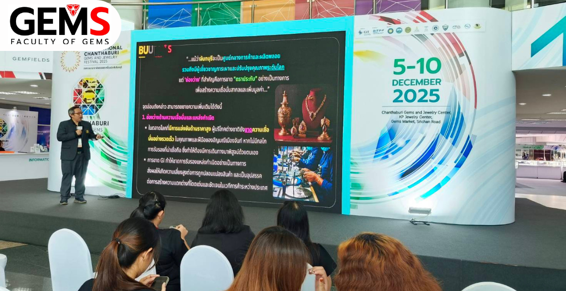 This activity featured a special lecture titled “The Golden Ticket of Chanthaburi Gems 2025,” presented by Lecturer Sayomphoo Hanpakdeesakul from the Gems & Jewelry Business Department, Faculty of Gems, Burapha University (Chanthaburi Campus). Held on December 8, 2025, at the Chanthaburi Gems & Jewelry Center during the International Chanthaburi Gems and Jewelry Festival 2025, the session focused on addressing industry “gaps” by utilizing the 4Ps Advantage to transform Geographical Indication (GI) into a strategic business edge. The lecture detailed how GI serves as a quality guarantee (Product), an opportunity for premium pricing (Price), a means to build trust in global E-commerce (Place), and a core for powerful storytelling (Promotion). Furthermore, the lecture showcased international success stories, including Rupa Tarakasi and Bohemian Garnet, to illustrate how GI functions as a vital anti-fraud mechanism and a tool for creating a certified “Regional Brand”. By establishing international standards for quality and provenance, this initiative aims to foster collaboration across all sectors to drive Chanthaburi toward becoming a sustainable and high-value “City of Gems” on the global stage.