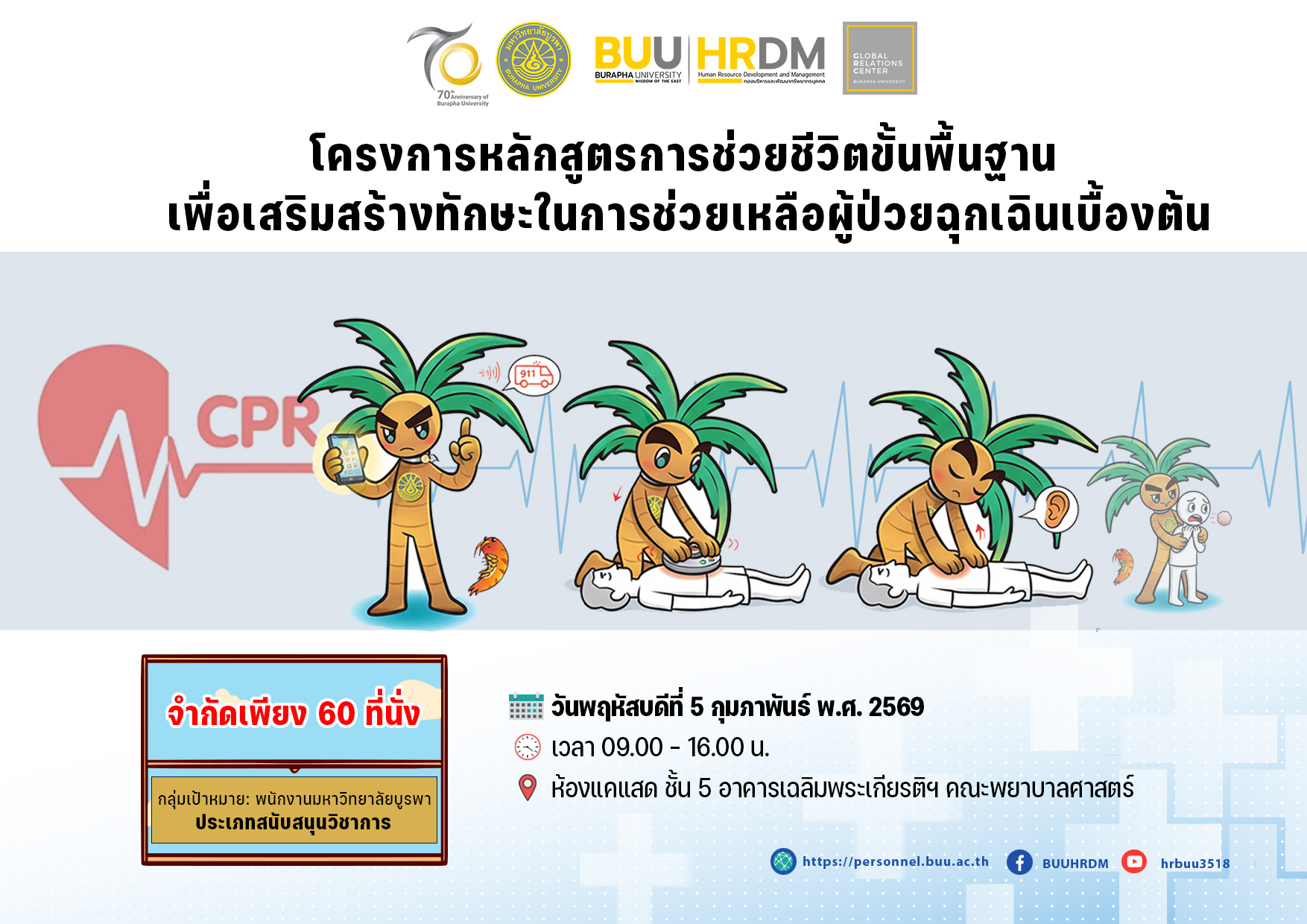 The Basic Life Support (BLS) Training Program to Enhance Emergency Response Skills was organized by the Human Resource Management and Development, Office of the President, Burapha University. The program reflects the University’s commitment to strengthening personnel capacity and ensuring that staff members are well-prepared to perform their duties and respond appropriately to unexpected situations. Medical emergencies such as sudden cardiac arrest, loss of consciousness, accidents, or acute illnesses may occur at any time within the university premises. When immediate and proper first aid is provided, the chances of survival significantly increase, the severity of symptoms can be reduced, and potential losses may be minimized before professional medical care is available.