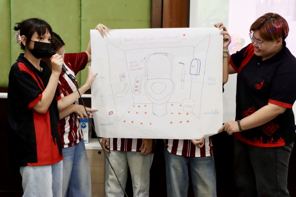 Through Design Thinking workshops, students applied principles of equality in practical design tasks, including creating inclusive bag designs and restroom facilities tailored to specific groups: women and young children, LGBTQ+ individuals, older persons, visually impaired individuals, working-age adults, and international tourists. These activities required research, collaborative discussion, and prototype development, encouraging students to consider differences in physiology, gender identity, physical ability, language, and cultural needs.