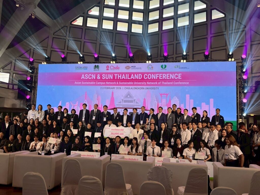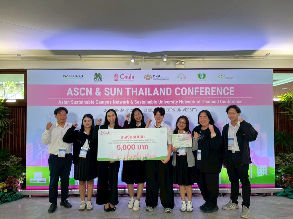 Students from the Environmental Health Program, Faculty of Public Health, Burapha University, received an Honorable Mention Award for presenting their innovation project, a lime peel–based antimicrobial spray, at the student sustainability project competition during the Asian Sustainable Campus Network Conference (ASCN) held alongside the 10th Sustainable University Network (SUN) of Thailand Annual Conference held from February 2-3, 2026 at Chulalongkorn University. The conference aimed to strengthen the network of sustainable universities in alignment with the Sustainable Development Goals. It encouraged students to actively participate in initiatives that help achieve these goals, particularly by promoting sustainable behaviours and lifestyles on university campuses. In addition, the conference fostered collaboration between Thai universities and institutions from other countries, enabling participants to share knowledge, experiences, and best practices in sustainable development.