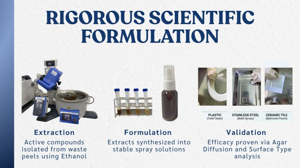 The student innovation demonstrates a 100% BCG-based, chemical-free approach that uses lime peel waste to produce an eco-friendly antimicrobial spray. The sprays were tested for their ability to inhibit microbial growth. E. coli was selected as the representative microorganism, as it is commonly found in the human gastrointestinal tract and serves as an indicator of faecal contamination. Laboratory results showed that the spray could reduce bacterial contamination on plastic surfaces by up to 83%, making it a promising solution for improving hygiene in public facilities while minimising environmental impact.