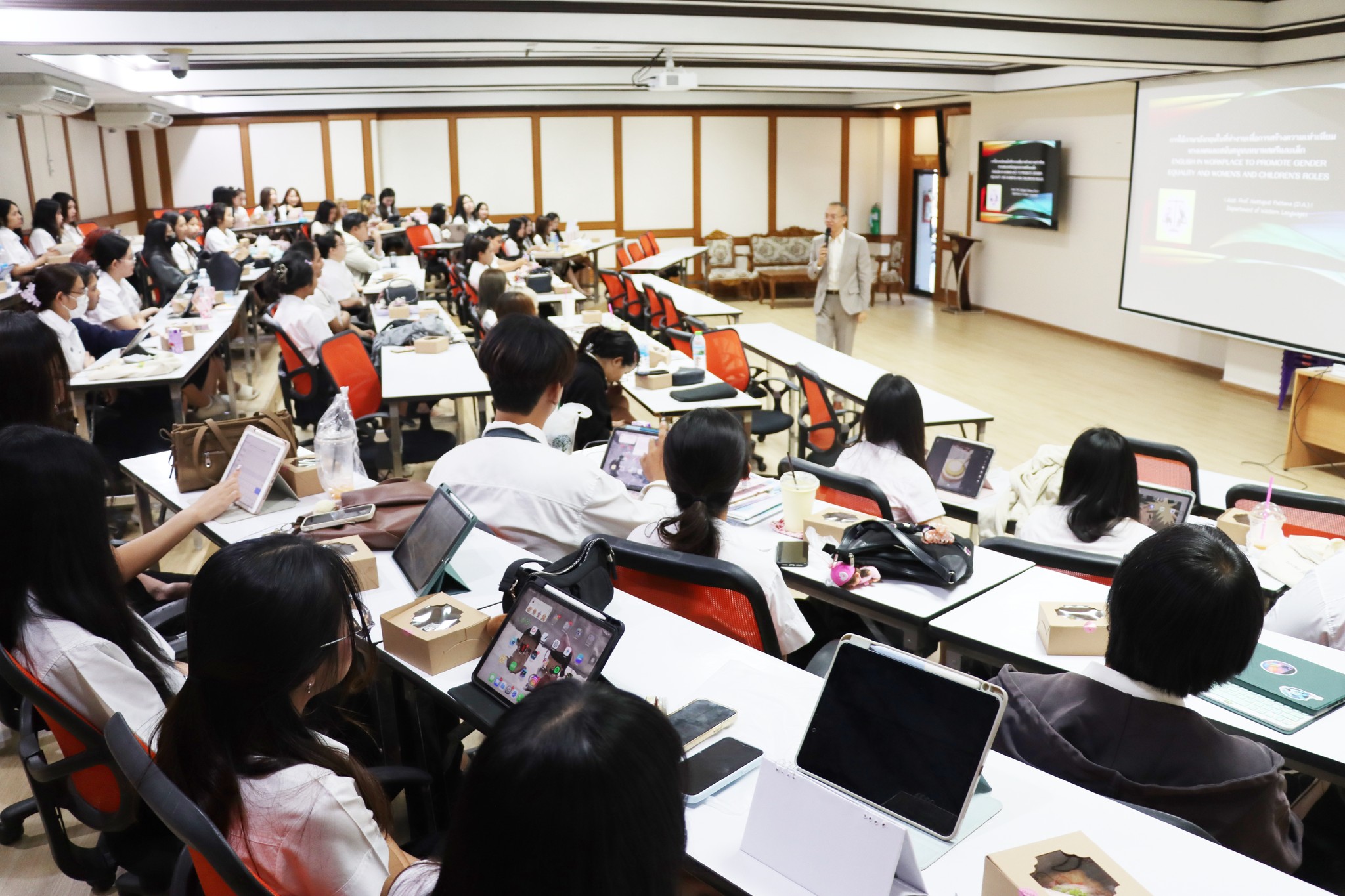 The project was implemented through training activities and educational lectures for students prior to graduation. A special lecture titled “English in the Workplace for Promoting Gender Equality and Supporting the Roles of Women and Children” was delivered by Assistant Professor Dr. Nattapat Pattana from the Department of Western Languages, Faculty of Humanities and Social Sciences, Burapha University. The lecture provided insights into the use of English in workplace contexts while fostering understanding of gender equality and non-discrimination in organizations. The activities included knowledge sharing, discussions, and question-and-answer sessions to promote comprehensive understanding. In addition, activities were organized to prepare students for their future careers, encouraging them to recognize the importance of adaptation and self-development in professional life. The program concluded with remarks and encouragement from faculty members of the Department of Thai Language, offering guidance and inspiration to students before graduation.