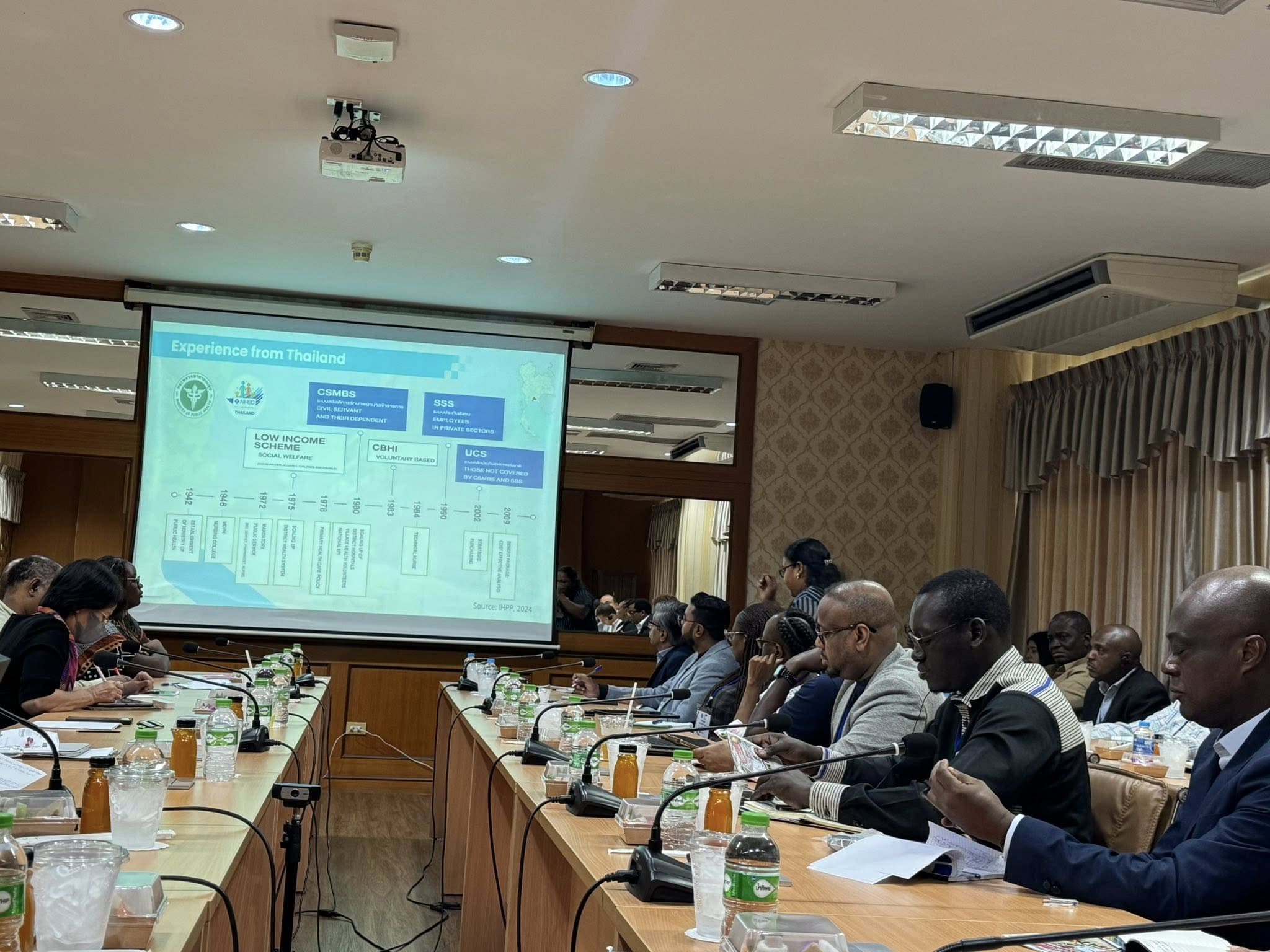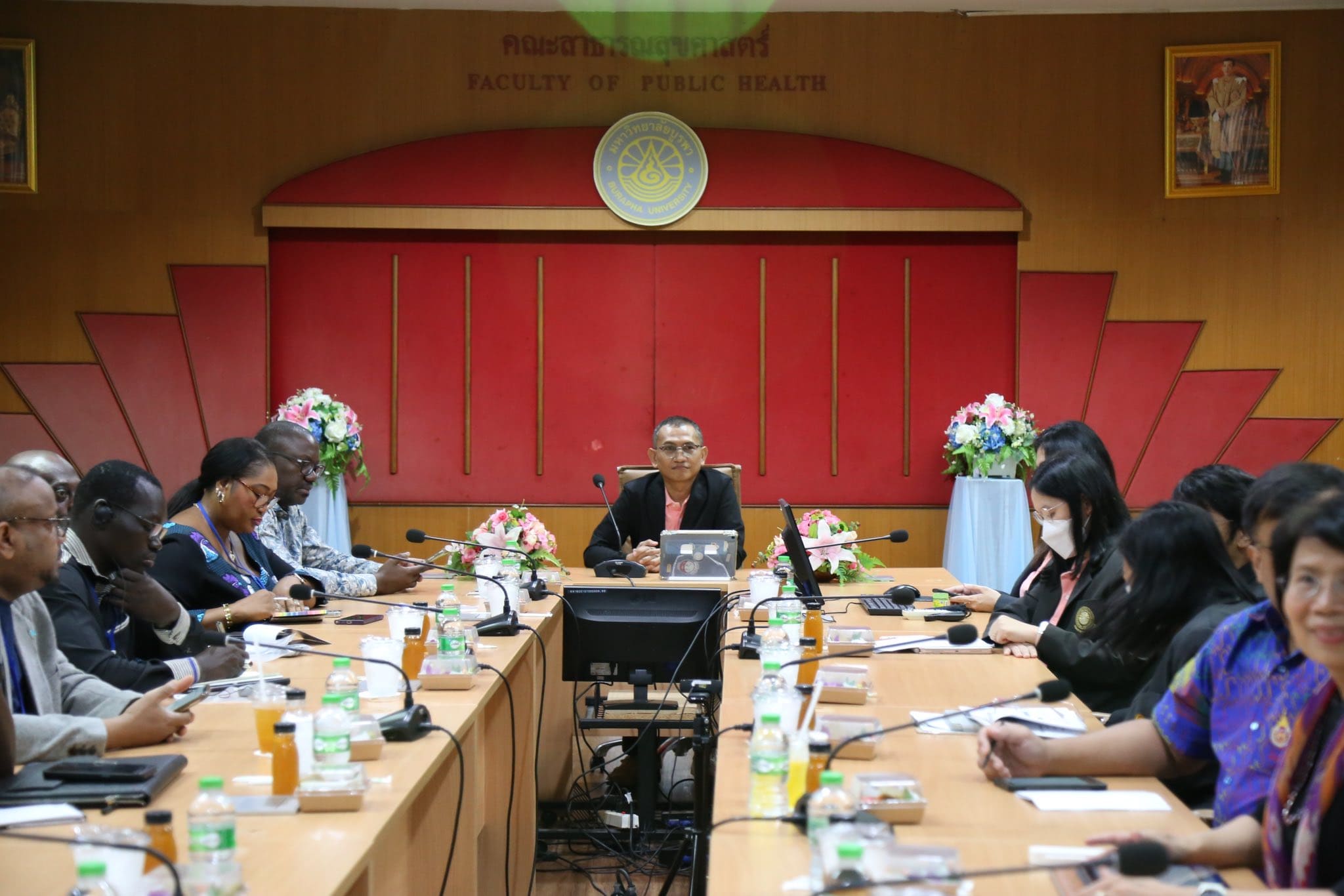 On May 12, 2025, at 10:00 a.m., Associate Professor Dr. Kowit Suwannahong, Dean of the Faculty of Public Health, along with the administrative team, faculty members, and representatives from Saensuk Municipality, welcomed Lieutenant Sarawut Preedadilok, Deputy Chief of Mission, Department of International Cooperation, Ministry of Foreign Affairs, and representatives from the African Union (AU) for an exchange of knowledge on Universal Health Coverage (UHC) as well as integrated health promotion and disease prevention. This exchange was conducted under the framework of a collaborative project to enhance cooperation between Thailand and African nations.