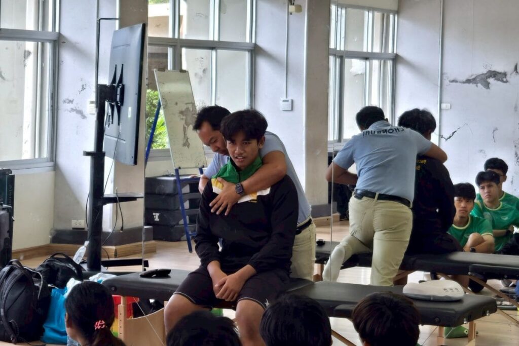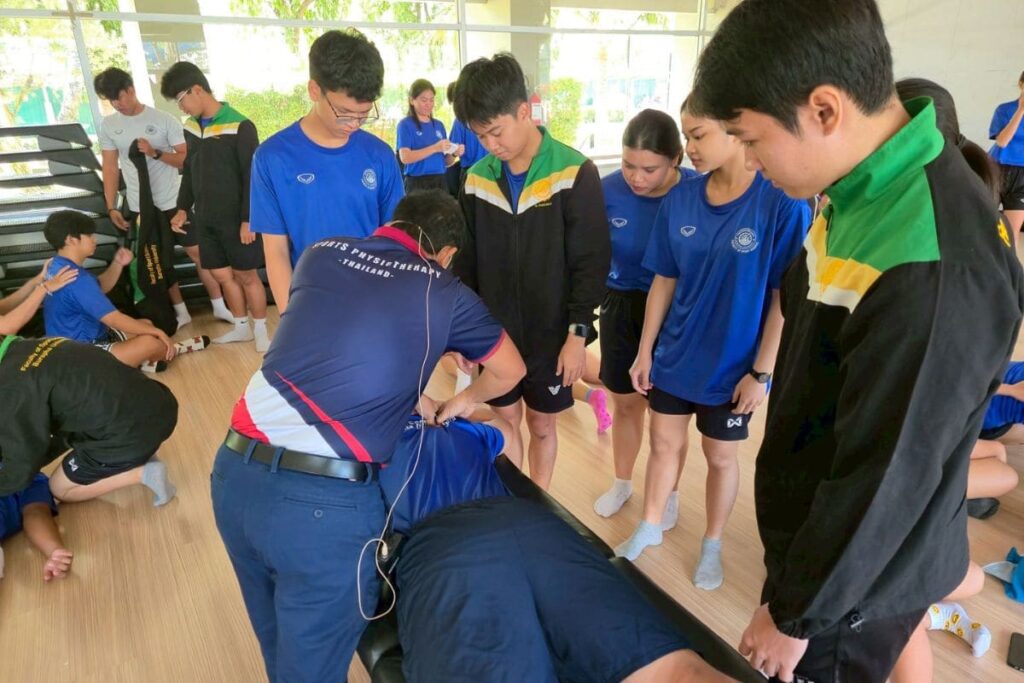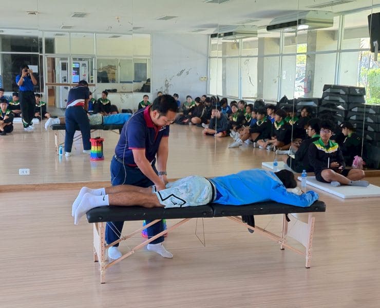 Course: “Sports Massage Practitioner” Date: August 23 – 24, 2025 Instructor: Mr. Thanat Tikpanyawut Position: Senior Physical Therapist, Laem Chabang Hospital. There were 55 participants. The course includes a lecture on muscle anatomy, physiology, and various massage techniques. The personnel must adapt and apply knowledge to sustain academic services under the Sports Enterprise Center.